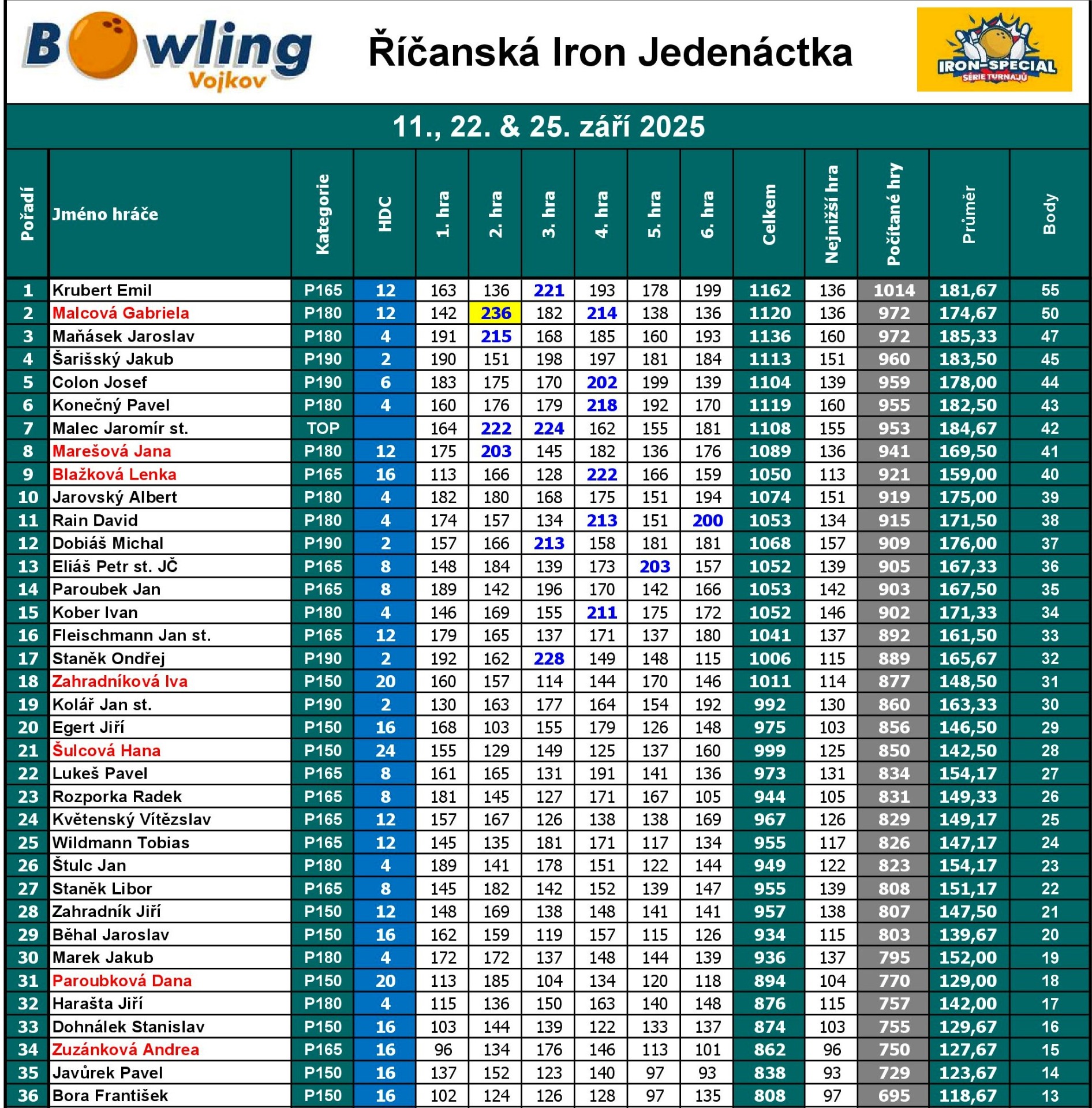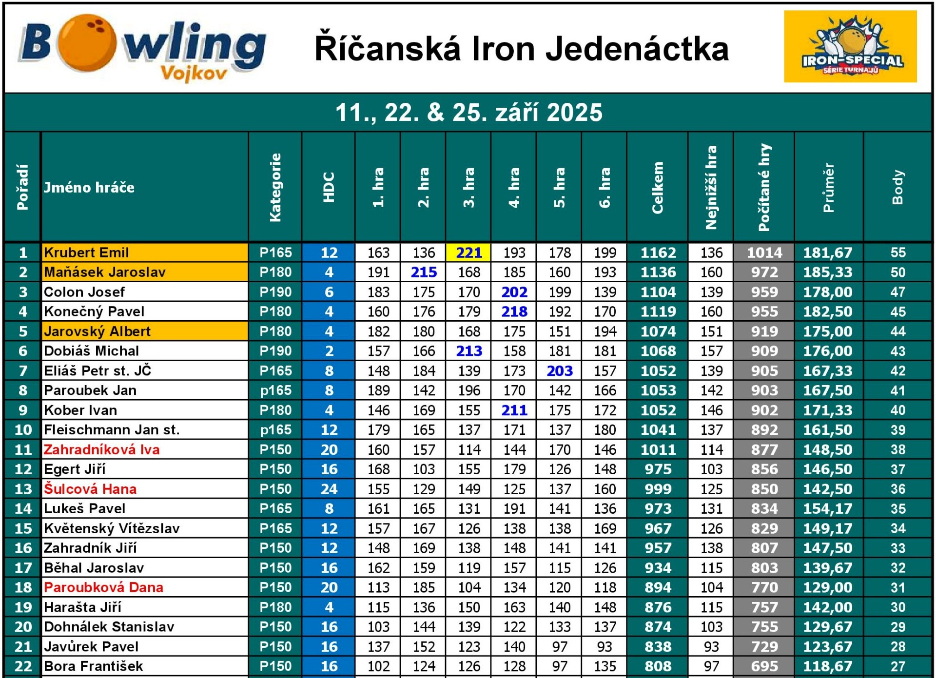 Ve čtvrtek 25. září se závěrečným třetím hracím dnem po odehraném úvodním ve čtvrtek 11. září a druhým v pondělí 22. září uzavřela historie letošního devátého turnaje, jediného zdejšího kategorie A, Říčanské Iron Jedenáctky na herně Bowlingu Vojkov.