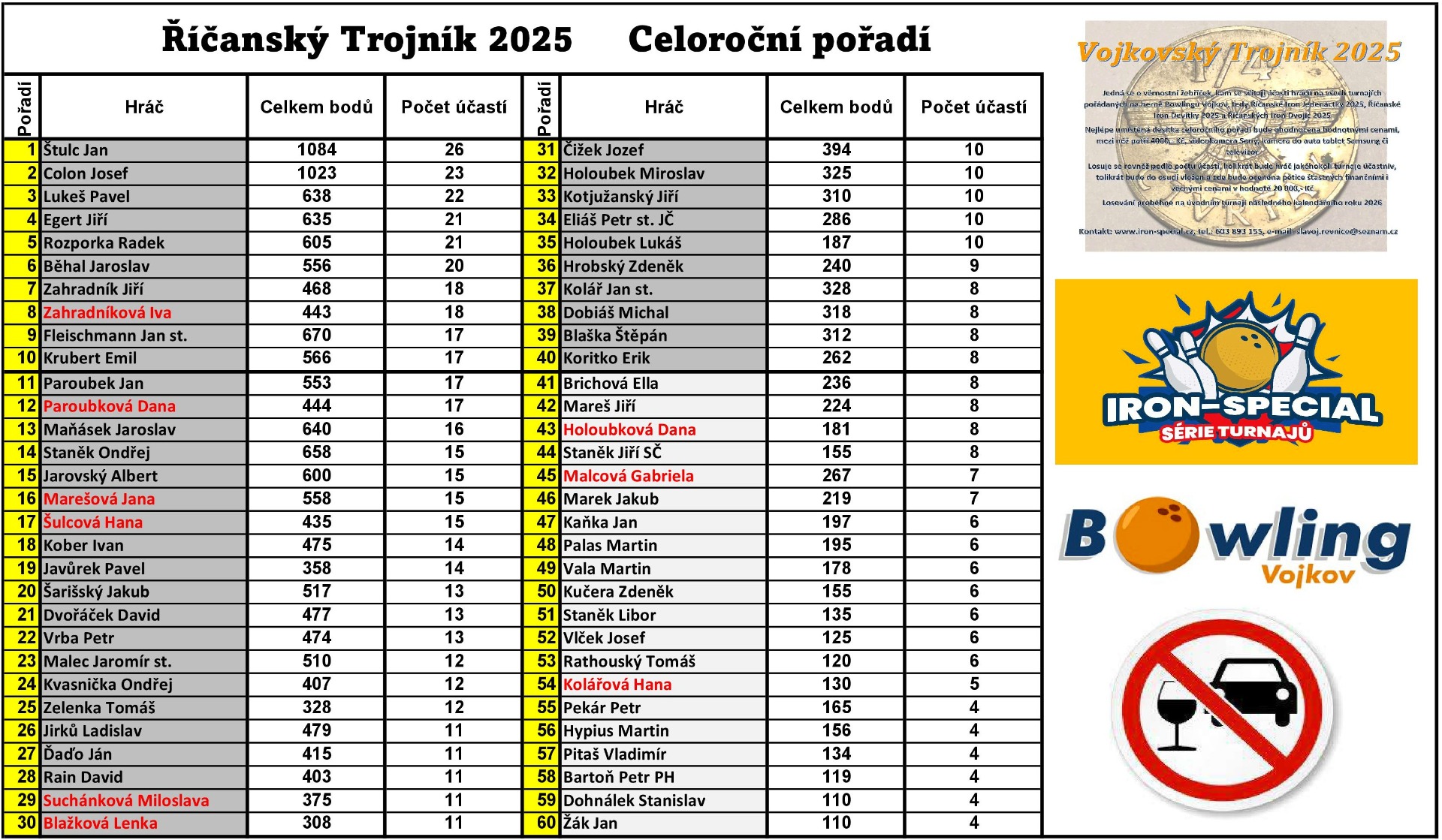 Díky odehranému letošnímu předposlednímu turnaji ze všech sérií roku 2025, hraných pod hlavičkou "Iron" a sice v úterý 2. prosince závěrečným turnajem vůbec na herně Říčanského Bowlingu Vojkov, a to Říčanského Vánočního Iron Devítkoosmičkového Specialu se jako první ze tří turnajových věrnostních sérií kompletně uzavřelo pořadí toho zdejšího a sice Říčanského Trojníku 2025.