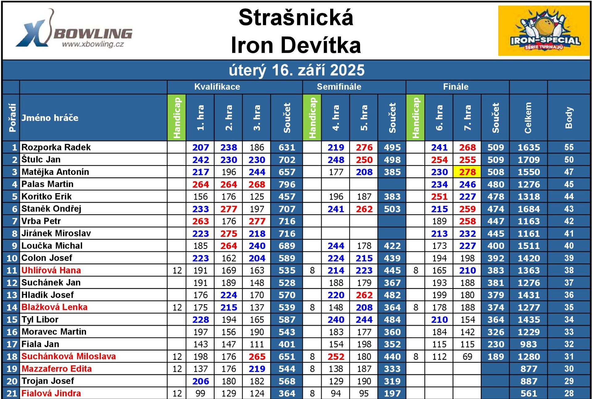 V úterý 16. září se uskutečnil letošní devátý turnaj pravidelné série Strašnické iron Devítky na herně Xbowlingu Strašnice.